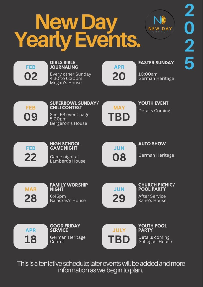 As of Christmas Eve 2023 New Day Church will be permanently meeting at the German Heritage Center in Frankfort Illinois.